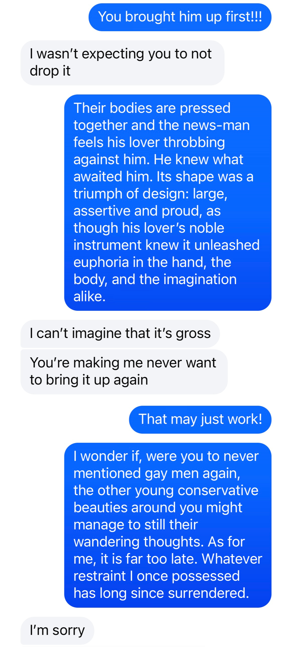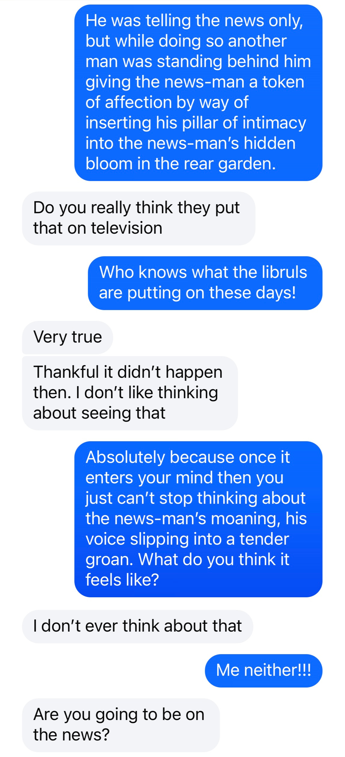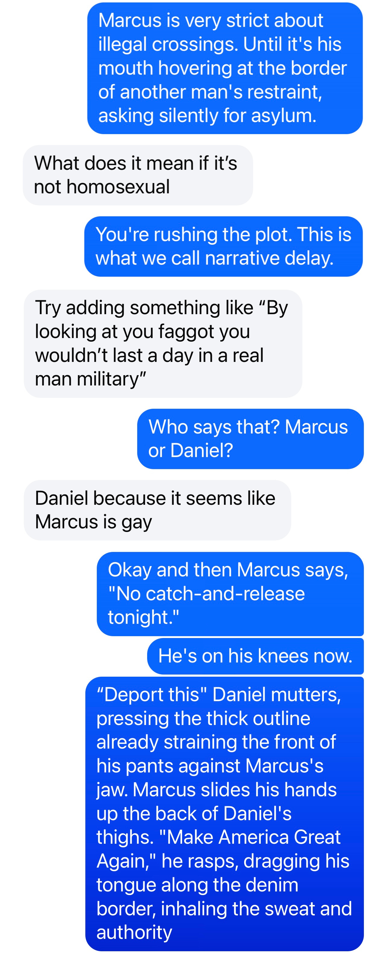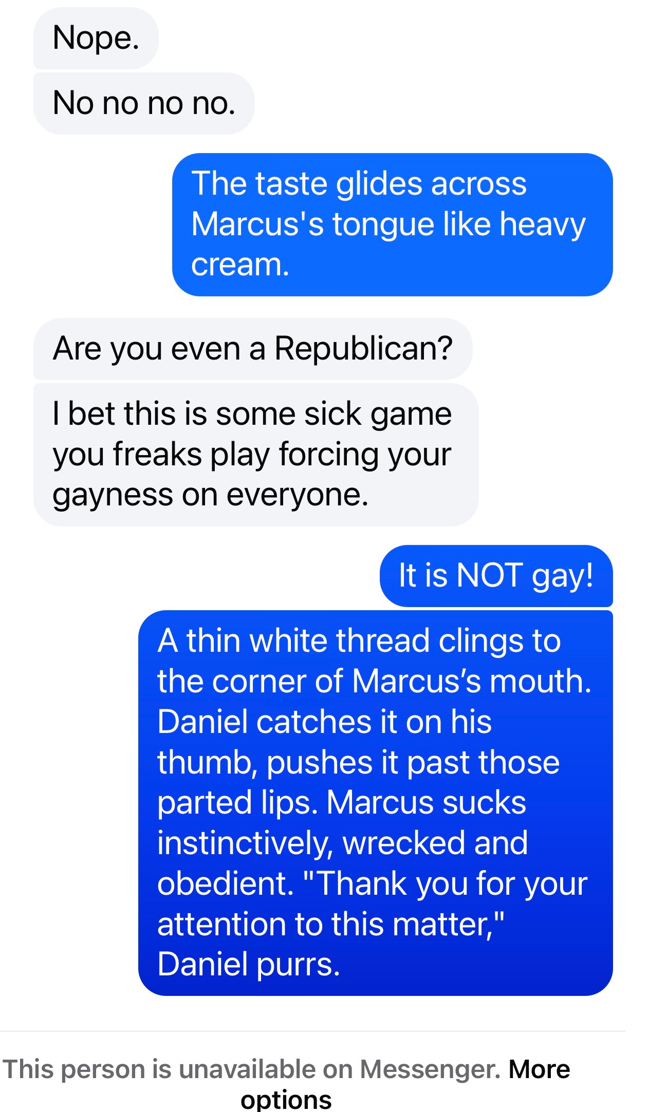 I have more of Daniel and Marcus’s entirely non-gay story narrative prepared to tell to another MAGA who wanders into my inbox. Stay tuned.