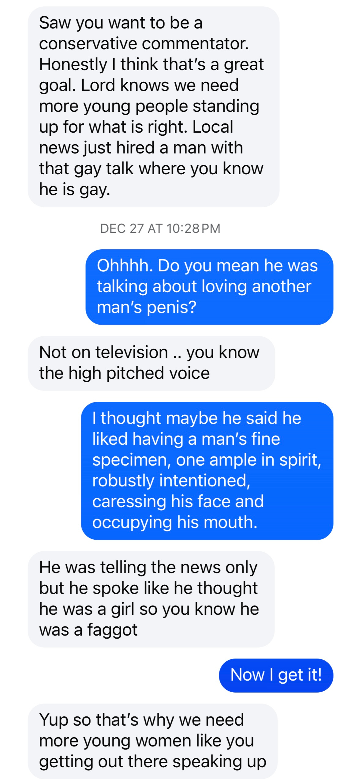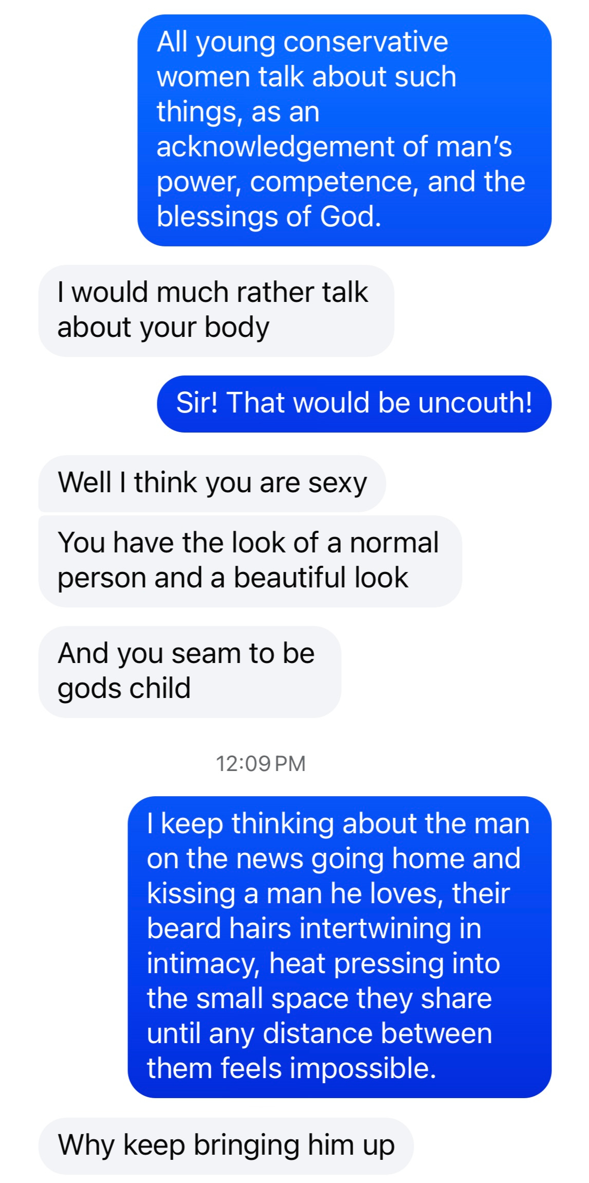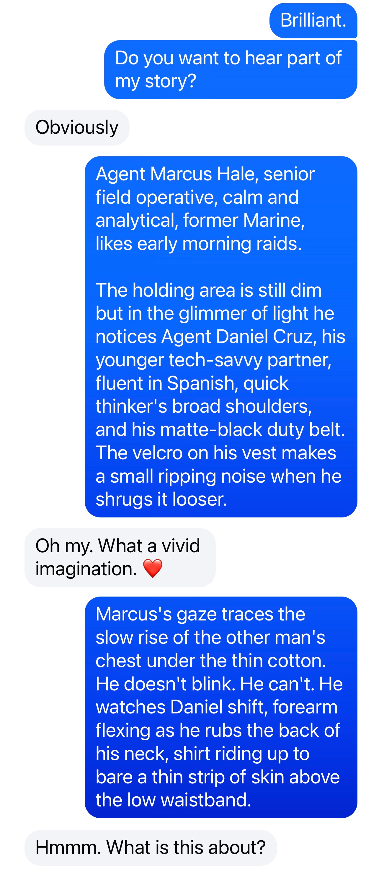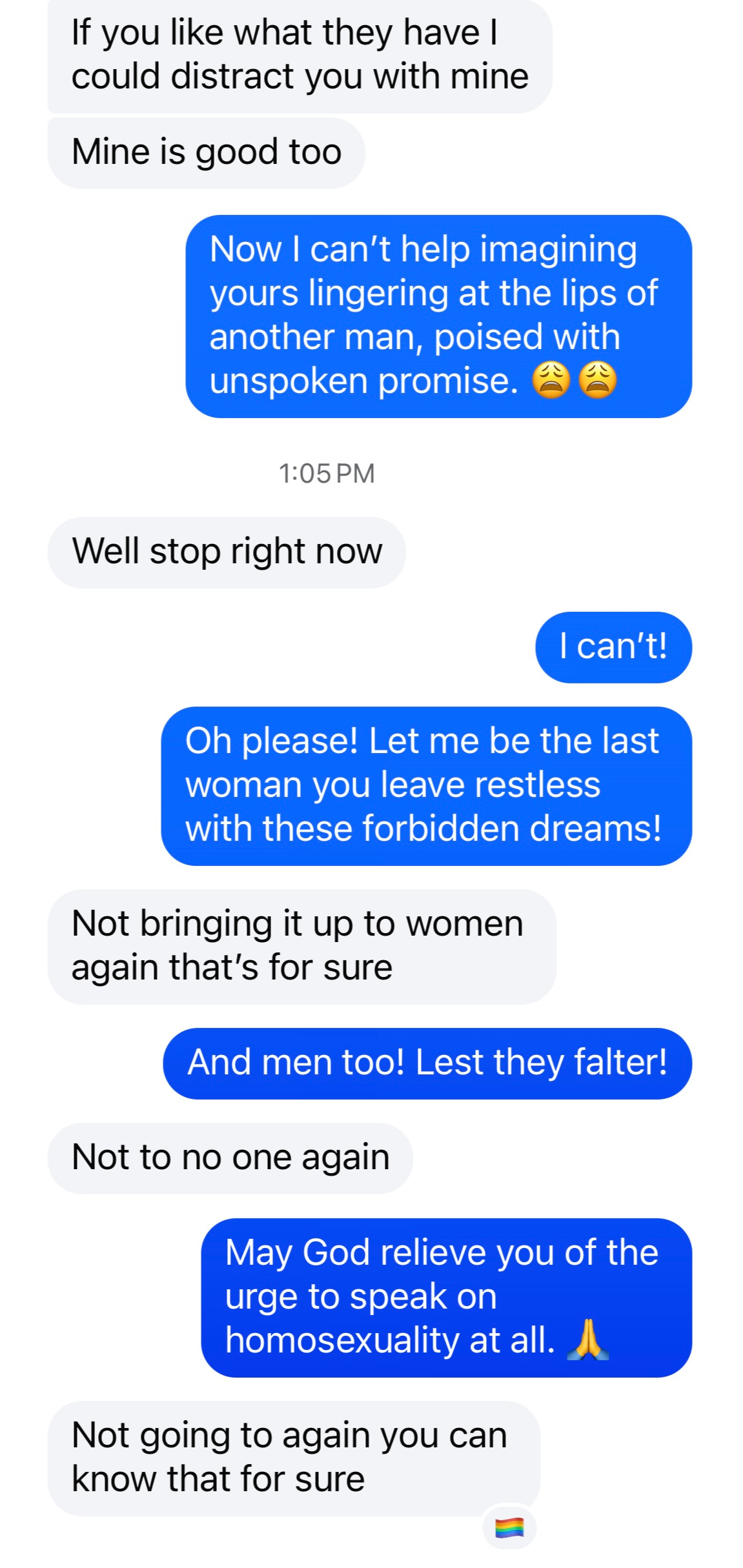 I have more of Daniel and Marcus’s entirely non-gay story narrative prepared to tell to another MAGA who wanders into my inbox. Stay tuned.