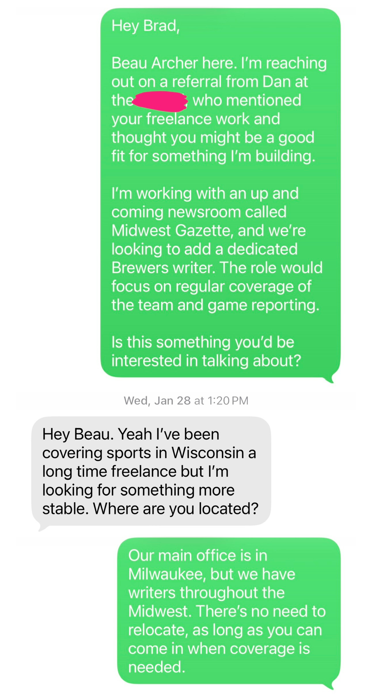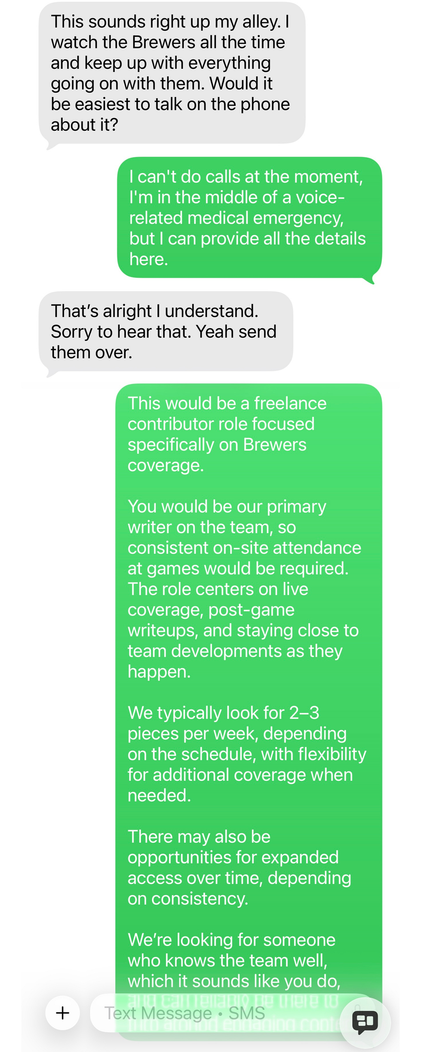 The conversation goes on a bit, but I won’t have you read it all because it didn’t work. Brad got suspicious and ghosted. Perhaps he talked to Dan about this referral. Perhaps he rethought out what a voice-related medical emergency possibly was. As good as I am at getting inside men’s heads, it doesn’t always work.