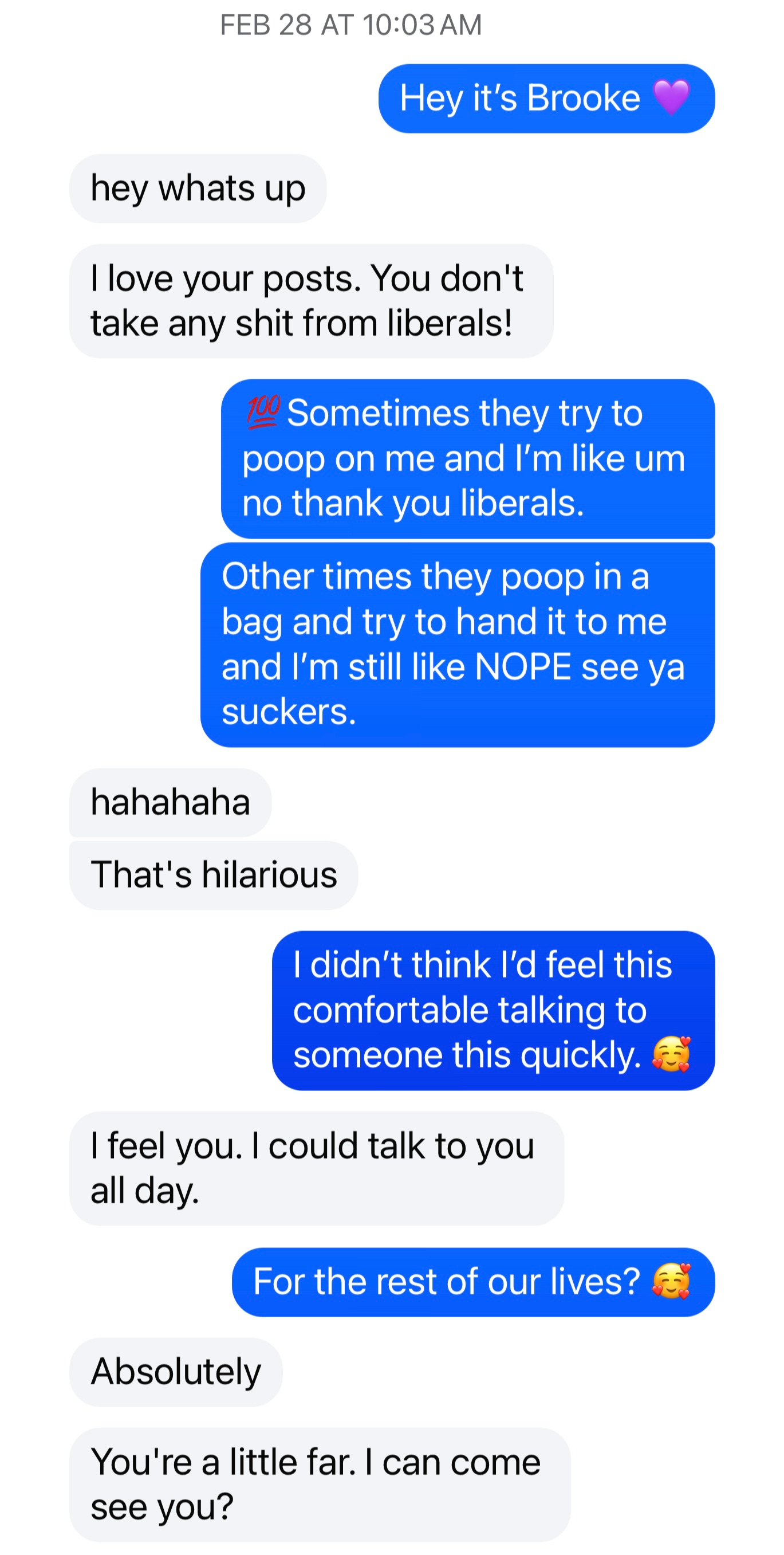 If you’re new here, typically I play a satirical conservative named Brooke America. Brad originally messaged my actual profile, but it was time to send Brooke America in.