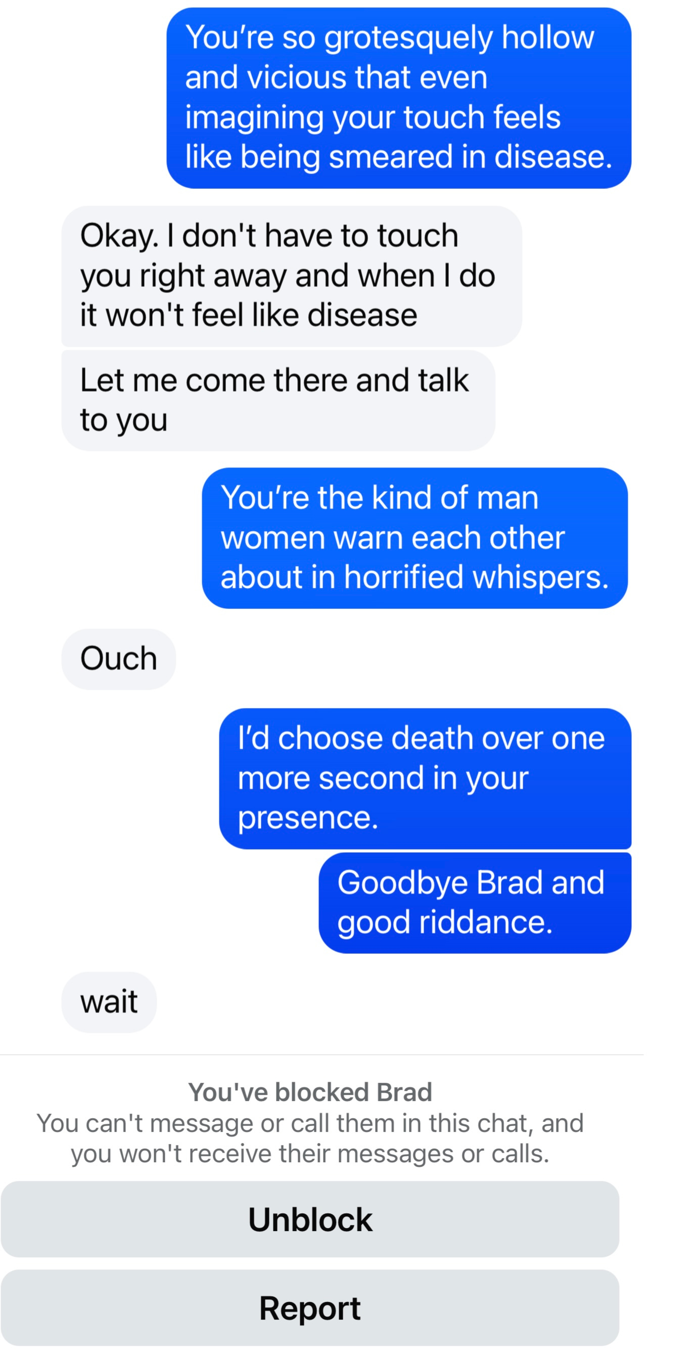 You're so grotesquely hollow and vicious that even imagining your touch feels like being smeared in disease.