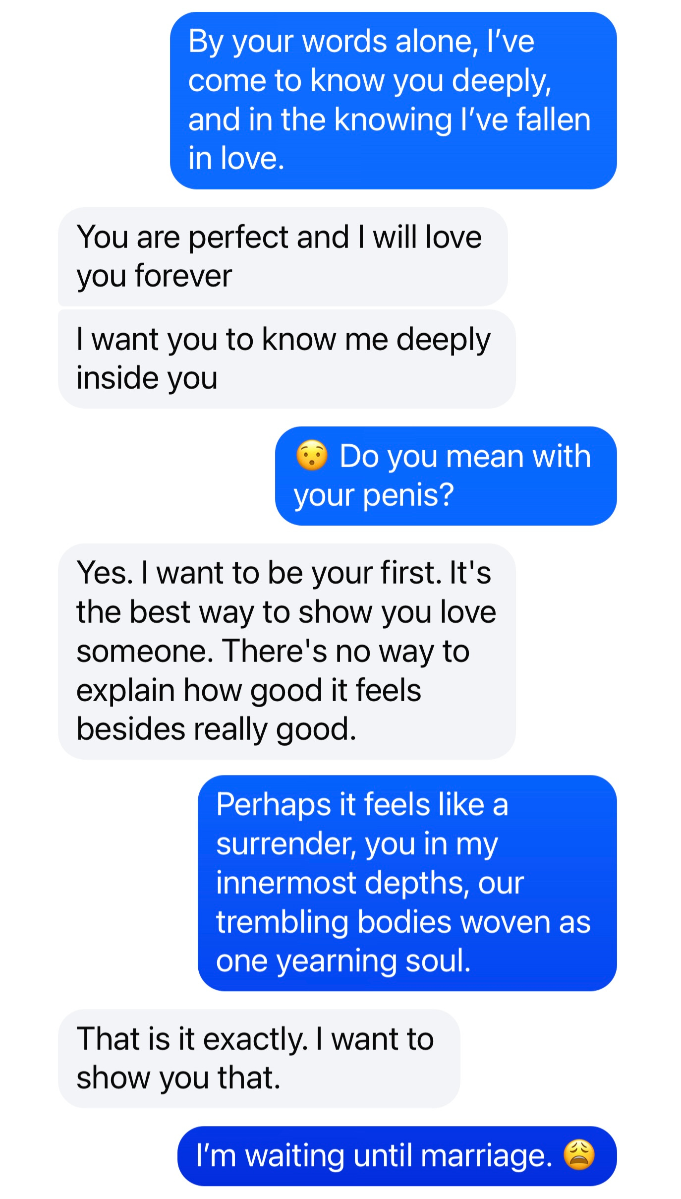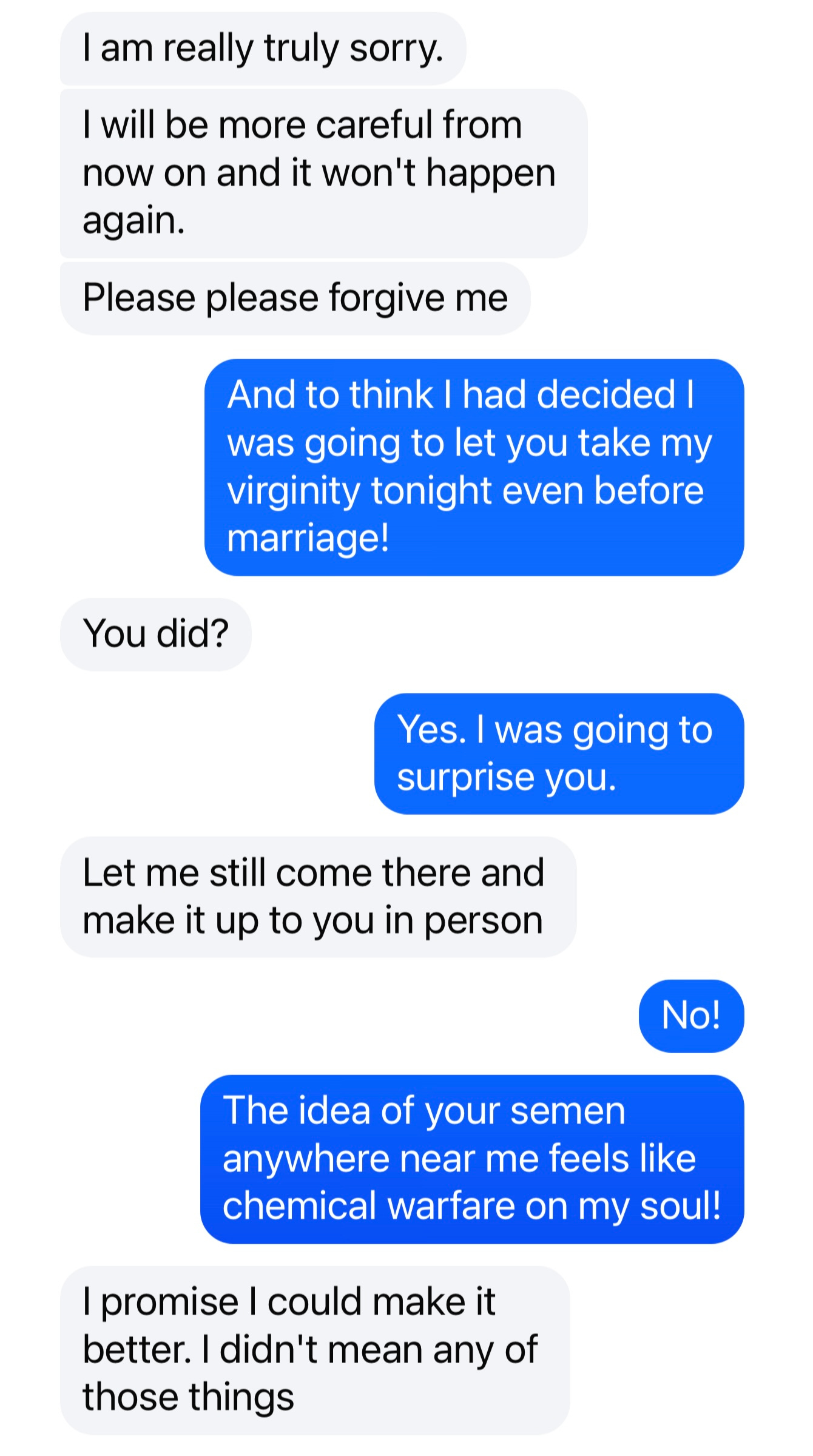 I let the days linger on, giving him time to imagine this perfect 18-year-old virgin being his own. To picture a life with her vagina and a butthole not full of diarrhea.